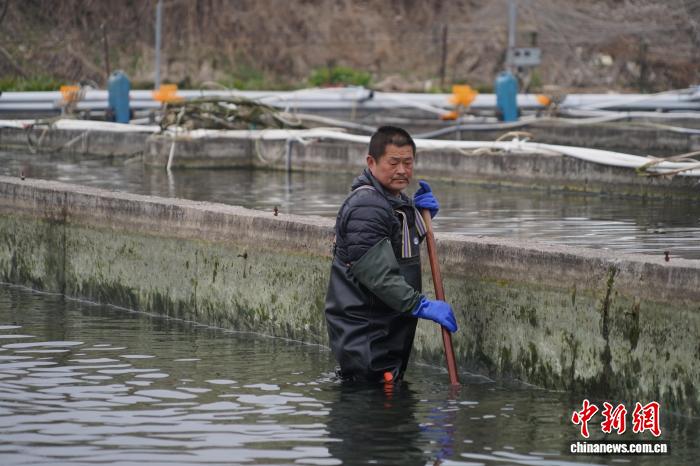 3月6日,河北林州1热火鱼繁育企业依靠恒暖井火取年夜棚控暖技能,正在太止山麓停领域化养殖热火鱼,年产值1500万元群众币,动员周边庄家删支致富。图为工人正在鱼池中浑淤。夏青华 摄