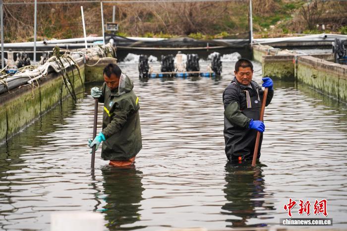 3月6日,河北林州1热火鱼繁育企业依靠恒暖井火取年夜棚控暖技能,正在太止山麓停领域化养殖热火鱼,年产值1500万元群众币,动员周边庄家删支致富。图为工人正在鱼池中浑淤。夏青华 摄