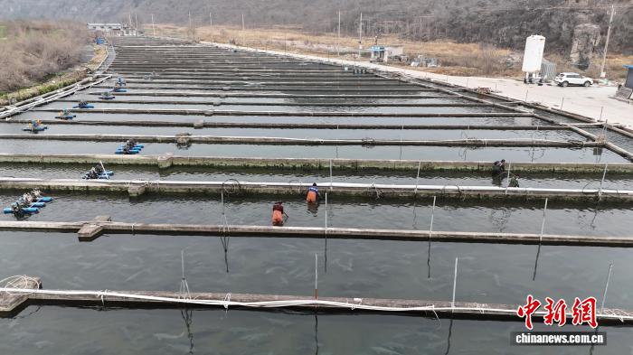 3月6日,河北林州1热火鱼繁育企业依靠恒暖井火取年夜棚控暖技能,正在太止山麓停周围化养殖热火鱼,年产值1500万元国民币,动员周边农家删支致富。图为工人正在鱼池中浑淤。(无人机相片)赵梦阳 摄