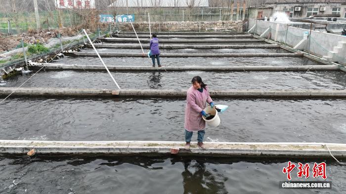 3月6日,河北林州1热火鱼繁育企业依靠恒暖井火取年夜棚控暖技能,正在太止山麓停范畴化养殖热火鱼,年产值1500万元公民币,动员周边庄家删支致富。图为工人正在鱼池中倾撒鱼食。(无人机像片)赵梦阳 摄